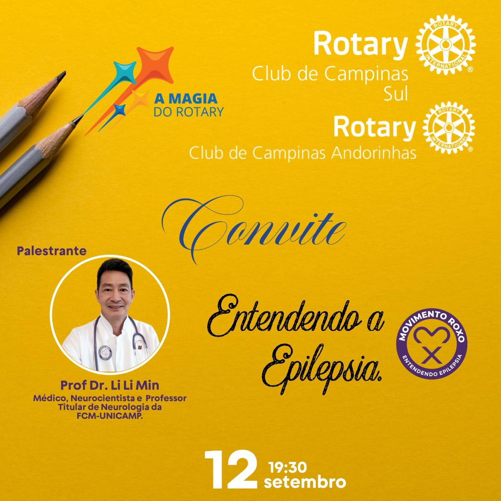 A reunião interclubs promoveu palestra sobre Epilepsia com o professor Dr. Li Li Min, médico, neurocientista e professor tiutlar de neurologia da FCM-Unicamp, em que compartilhou conhecimento, esclareceu mitos e falou sobre o Movimento Roxo, em que todos podemos falar sobre epilepsia e ajudar ao próximo.